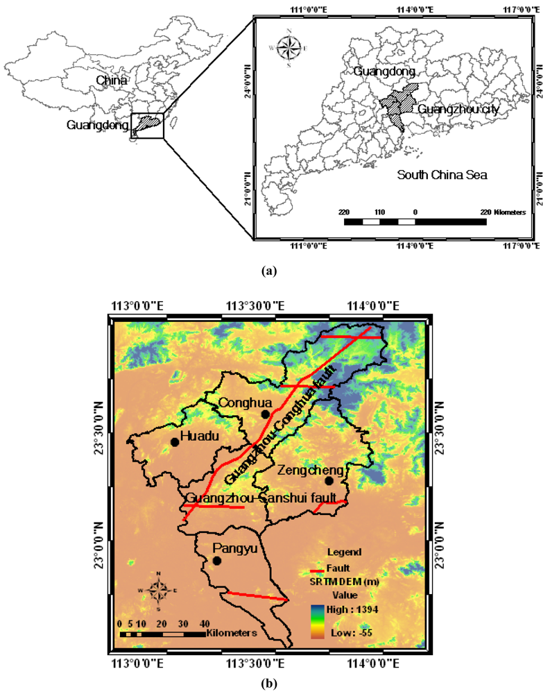 The landform of Guangzhou city corresponds to hilly country, with altitudes of about 200–1,000 m. The north terrain is higher than the south [5]. The urban area of Guangzhou is located in the Guangdong Depression Belt of the South China fold system. There are more than 40 faults and 30 folds. The Guangzhou-Sanshui fault and Guangzhou-Conghua fault divide the city into three sub-geological structure units: Guangzhou-Huadu fault basin, Zengcheng salient, and the Pearl River Delta Depression [5]. These large-scale structures constitute potential causes of ground surface deformation.