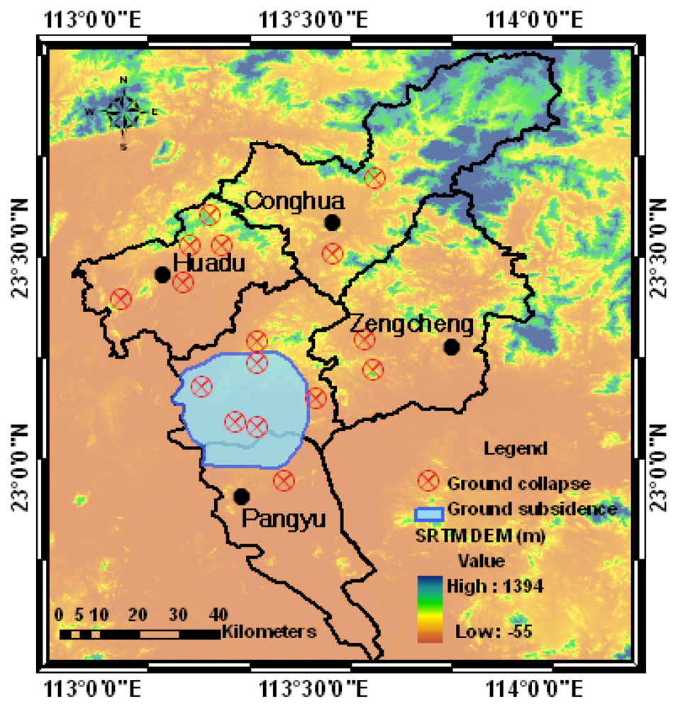 Guangzhou city, the study area of this work, is a mega-city and a major industrial development center in South China. In recent years, the development of this city has severely been hampered by problems induced by ground subsidence. Investigations indicate that the main factors causing ground subsidence in Guangzhou include natural factors, such as Karst geomorphologic collapse, and deformation of soft soil, and human activities, particularly activities such as over-pumping underground water from the groundwater supply source located in the Karst geomorphologic structure and subway construction [5–7]. Thus, development of new technology for accurate and dynamic detecting of ground subsidence in the Guangzhou urban area is of significance for engineering design, city development zoning, and decision-making.