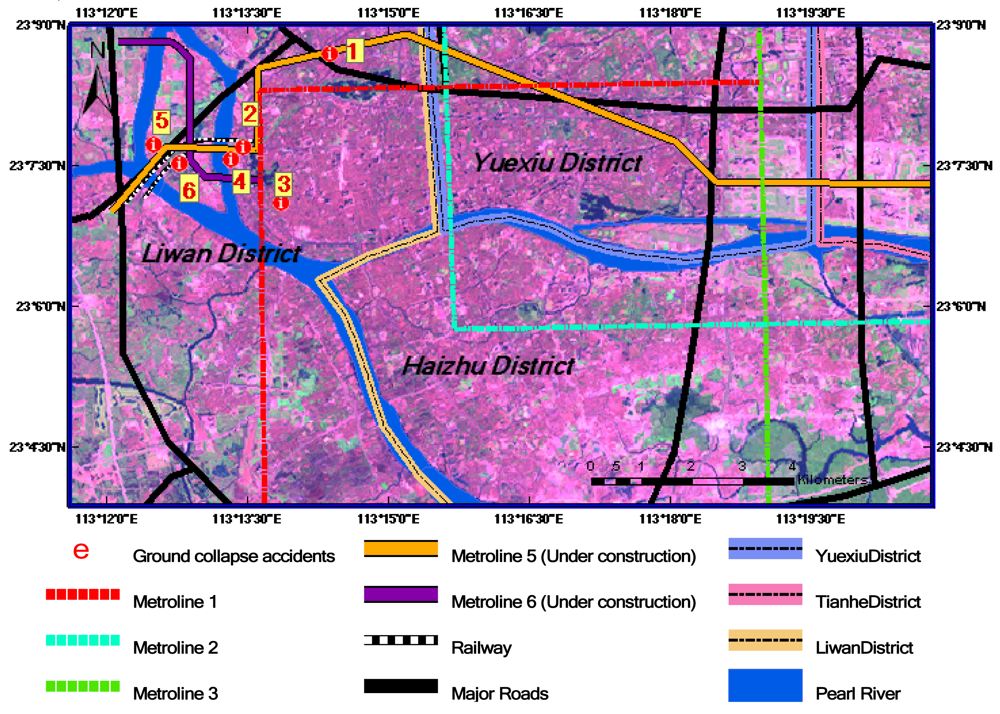 Ground collapse accidents in Guangzhou in 2007–2008 are coded from 1 to 6 in Figure 3.