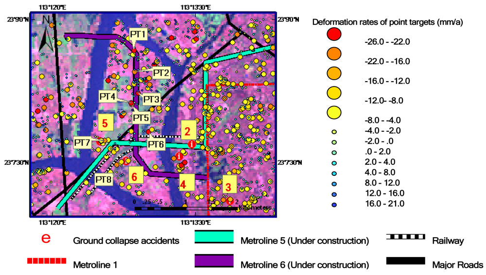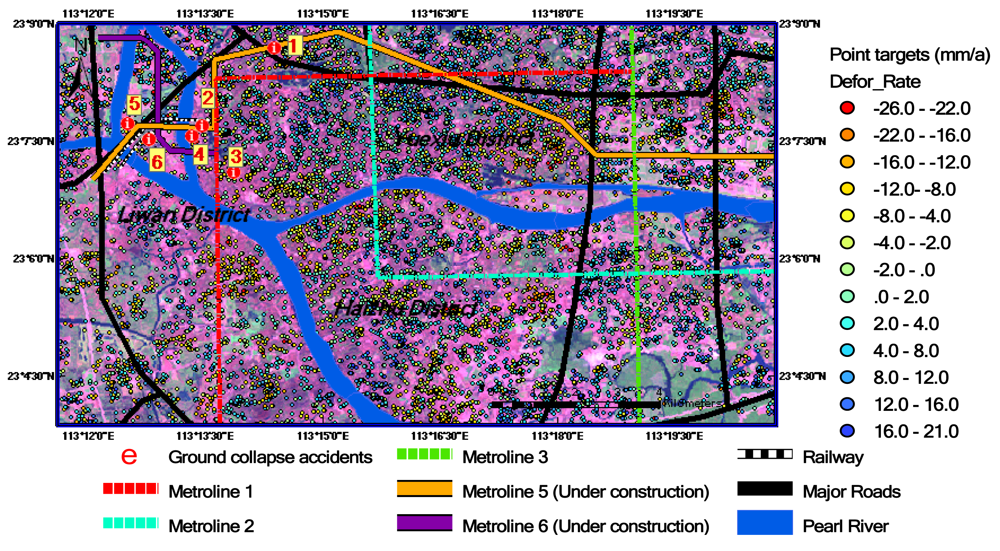 A ground deformation rate map of IPTA-derived point targets in Guangzhou using ASAR data listed in Table 1. Deformation rates are color-coded, as shown on the right-hand side. Numbers 1–6 as marked in Figure 3 show the locations of ground collapse accidents that occurred in 2007–2008. (The background image is Landsat TM false color composite image. The spatial resolution is 30 m.).