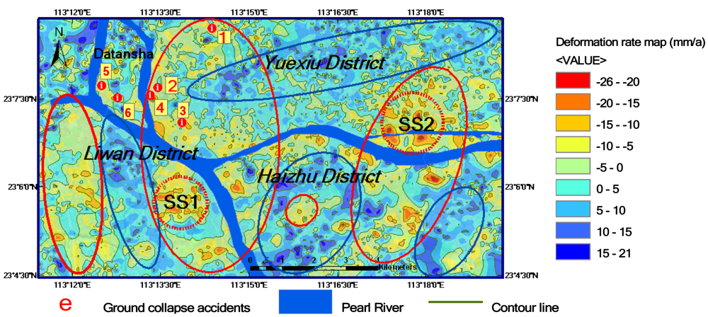 The horizontal resolution of the ground deformation rate contour map is 100 m and the vertical resolution is 2 mma-1. Thus, the map contains rich information on ground deformation, which is important for various users. In order to describe 2-D spatial distribution features of ground deformation in the study area, the connected subsidence (rise) areas are circled by red (blue) ellipses. One can see three major subsidence zones. The largest zone is located in the middle west of the study area, which runs from the north border to the south border and crosses the Pearl River. A high subsidence sub-region with a subsidence rate of -26 mma-1 is located in the south of the Pearl River as coded SS1 in the figure. Its area is about 2 km2. The secondary subsidence zone is located in the east of the study area. Its coverage is a little smaller than the largest one, and also distributed crossing the Pearl River. Within this subsidence zone, there is also a high subsidence sub-region with a subsidence rate of -26 mma-1, which is located in the north of the Pearl River as coded SS2 in the figure. Its area is about 6 km2. The third subsidence zone is located in the southwest of the study area. Between two subsidence zones, there is always a rise zone with a maximum rise rate of 21 mma-1. In the other words, the subsidence zones and rise zones are alternately distributed. The horizontal scale of the subsidence - rise patterns is about 5 km. These interesting patterns seem to show that they may be caused from the movement of local geological structure. Of cause, to conclude validation of this hypothesis, however, requires further evidence and examination.