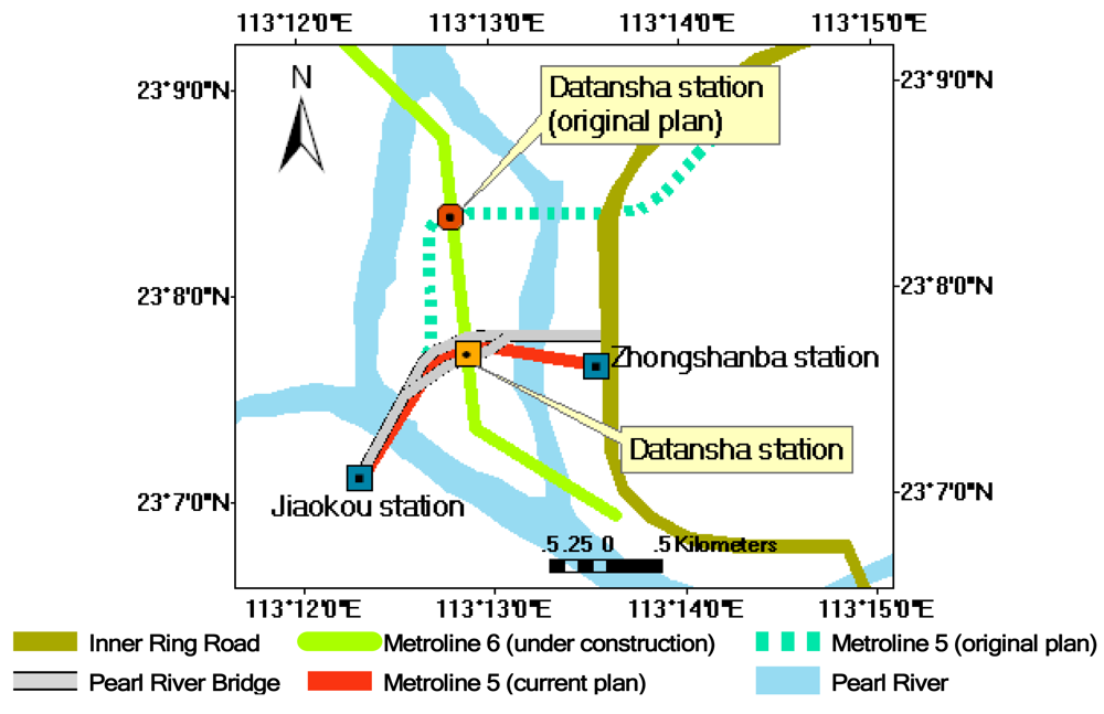 In the feasibility study phase of the underground metro-line project, the original design of metro-line 5 was expected to use the underground line (shown as dashed line in Figure 7). Meanwhile, an open surface method was chosen to construct Datansha station. A shield method was designed to construct the section from Jiaokou station to Datansha station. However, the initial plan was soon abandoned due to the complicated engineering geological conditions. According to the original design, the Guangzhou-Sanshui fault and metro-line 5 would intersect under the western branch of the Pearl River. Fault breccia is found at Datansha station. Quaternary sandstone is also developed here. The sandstone has strong permeability and the sandstone layer also has direct hydraulic connection with the Pearl River. The bedrock is constituted by cretaceous red sandstone and carboniferous Huanglung limestone. Thus, lithology is complicated. Moreover, Huanglung limestone is well developed here. During the drilling process, a moderately large cave was found, and ground collapse occurred. Thus, all the underground lines west-eastward going through Datansha Island would inevitably pass through limestone. Therefore, the final design of this segment is to build an elevated bridge instead of underground tunnels [23].