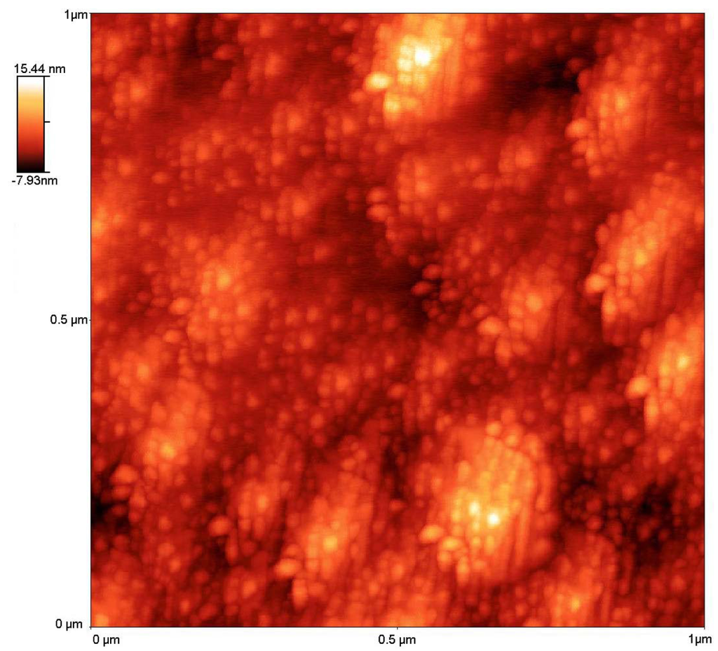 In some theoretical works, the wavelength shift has been rigorously determined by applying a more complex theory based on a vectorial method that uses hybrid modes and coupled mode theory []. Using this method and a two-overlay coating based analysis, this structure can be studied theoretically. Nevertheless, if we assume only one layer with a total effective index that considers both layers, higher and lower, it is also possible to analyze and predict the behavior of the proposed sensor in a more straightforward way. The immediate consequence of the shift in effective index due to the change in the ambient humidity is a displacement in all the attenuation bands, especially in the one under study and centered at 1,540 nm. In this type of porous sensitive nanofilms, the amount of water molecules in the interstitials gaps among the nanospheres is proportional to the increase of humidity. Figure 1 shows an AFM microscope image of the SiO2 rough surface. The sensing mechanism is quite simple: when the ambient humidity increases, the total effective refraction index of the coating raises, increasing the value of the propagation constants of the cladding modes with respect to the propagation constant of the core mode yielding a wavelength blue shift of the resonant peak.