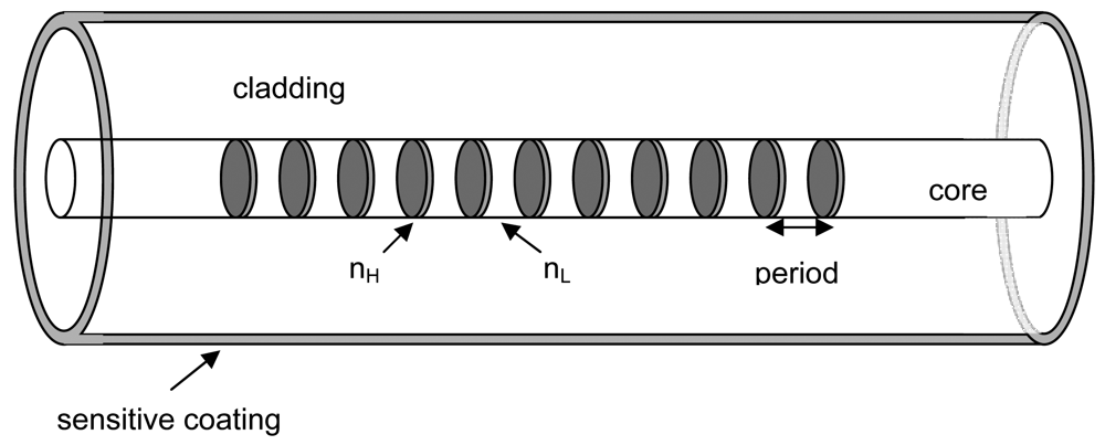 In order to analyze the spectrum evolution in structures based on LPG with a sensing overlay when the aim is only to detect the displacement of the resonance wavelengths, it is possible to use either the Bragg or the Bragg modified conditions []. The first one can be expressed as: