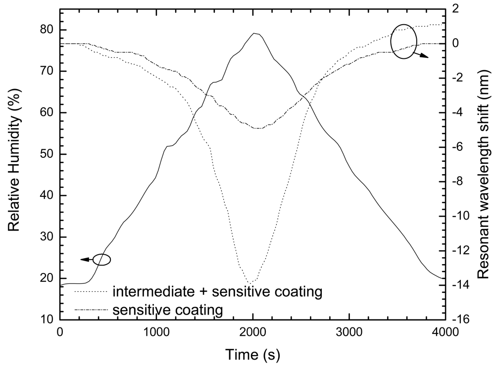 The thickness overlay is chosen to guarantee that the attenuation band is located where there is good sensitivity and where it does not vanish at the same time. In this work, the good sensitivity band corresponds to ∼1,520 nm. In fact, the same effect noticeable when the ambient humidity increases, can be appreciated when the thickness of the coating is getting increased (see Figures 2a and 2b). If the sensor is located near the vanishing area (around 1,500 nm using this LPG), it would be more sensitive to any humidity change, but it would not be possible to detect any change once the peak vanished. On the other hand, if the sensor is placed near the minimum resonant peak, the humidity sensitivity would be almost negligible, because the resonant peak shift would be extremely slow, as experimentally demonstrated in []. A halfway decision is more convenient to work out both design features. It is important to stop the building process of the sensitive layer at a point halfway between the minimum value and the value where the resonant peak vanishes. So, there must be a trade-off between sensor sensitivity (far from the minimum because the blue shift dependence is higher) and sensor maximum wavelength displacement detection range. Using the intermediate layer, the wavelength working point can be easily located in a more favorable value.