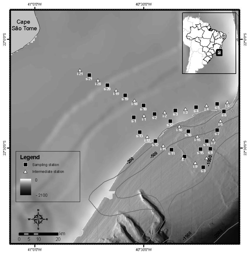 Chlorophyll measurements were done at 18 stations during an oceanographic cruise held in November 2004. The study area included the Brazilian Southeastern continental shelf and slope region, from Cape Sao Tome (22°S) to Cape Frio (23°S), at Campos Basin, Rio de Janeiro (Figure 1). Phytoplankton abundance was estimated from 2 L surface water samples filtered through Millipore cellulose membranes (0.45 μm). The filters were kept in liquid nitrogen and the chlorophyll-a concentrations were determined after extraction in 90% acetone for 18 hours at 4°C in a Turner TD-700 fluorometer [5].