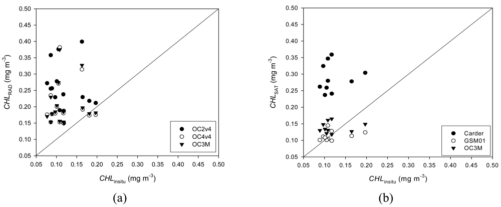 The SeaWiFS empirical algorithms Ocean Chlorophyll 4-bands - OC4v4 and Ocean Chlorophyll 2-bands - OC2v4, and the MODIS algorithm Ocean Chlorophyll 3-bands - OC3M were applied to the radiometric data to estimate CHL.