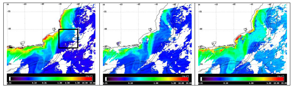 For illustration, examples of MODIS images processed using with the three algorithms tested in this study are shown (Figure 3). In the 11/25/2004 image, the oligotrophic waters of the BC are observed offshore, over the slope region, in dark blue colors (OC3M<0.08 mg/m3; GSM01<0.08 mg/m3; Carder<0.10 mg/m3). A surface signature of the mesoscale eddy with a mean diameter of 75-80 km was identified in front of Cape Sao Tome between 22.00°S–22.65°S, and 39.9°W–40.77°W, with relatively higher CHL values (0.10<OC3M<0.15 mg/m3; 0.08<GSM01<0.13 mg/m3; 0.20<Carder<0.30 mg/m3).