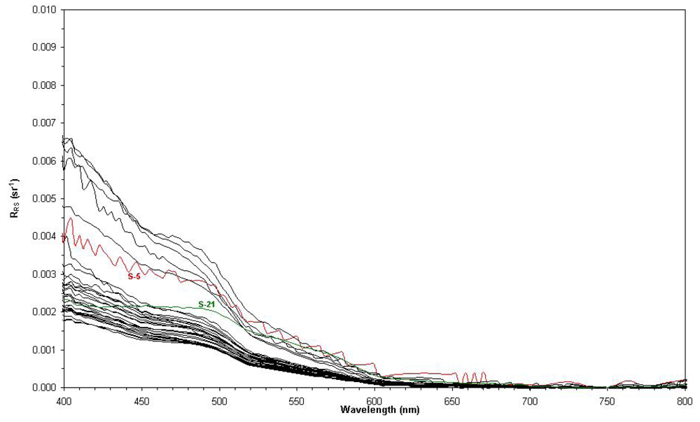 The spectral distributions of RRS measured at 30 stations are shown on Figure 5. In general, all the spectra are typical of Case 1 oceanic and oligotrophic waters with low chlorophyll concentrations. The noise observed at station S-5 (red on Figure 5) was due to the low light level at the time of data acquisition. The different shape of the spectrum at station S-21 corresponds to more coastal waters (green on Figure 5), with relatively higher chlorophyll concentration (0.54 mg/m3 OC3M) and with the probable presence of other optically active components.