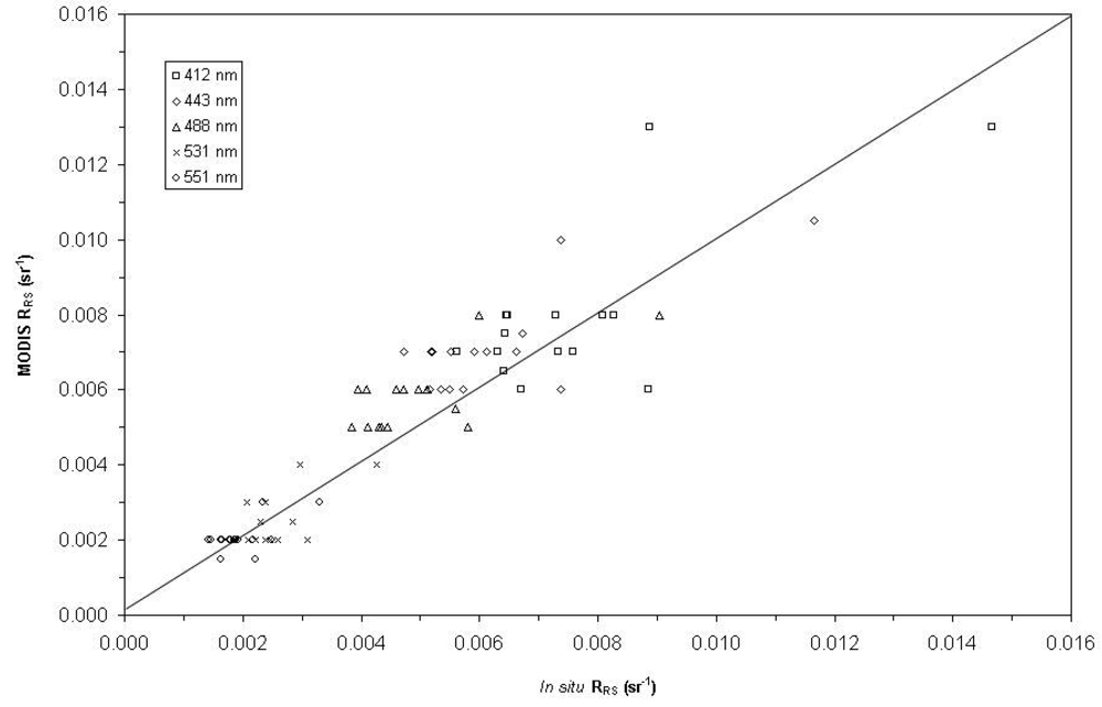 A spectral comparison between average MODIS-derived RRS and the in situ estimates from the radiometer for 15 “match-up” stations is shown in Figure 6. The 1:1 line of perfect correspondence is also shown. We define rmsd at any wavelength λ as [19]: