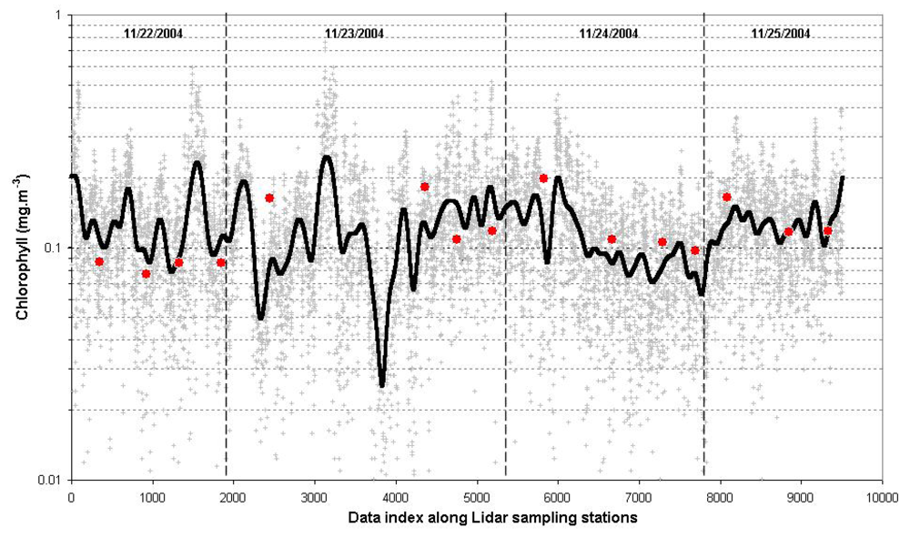 We learned from previous experiments that our lidar measurements are well correlated with the surface (∼1 m) chlorophyll concentration. The analysis conducted to adjust the lidar with the fluorometric estimates was based on the observation that de relative standard deviation (variance coefficient) of the latter was much higher than the former. As mentioned on Section 2.3, the values of CHLLIDAR were obtained by means of a single equation (see Equation 6).
