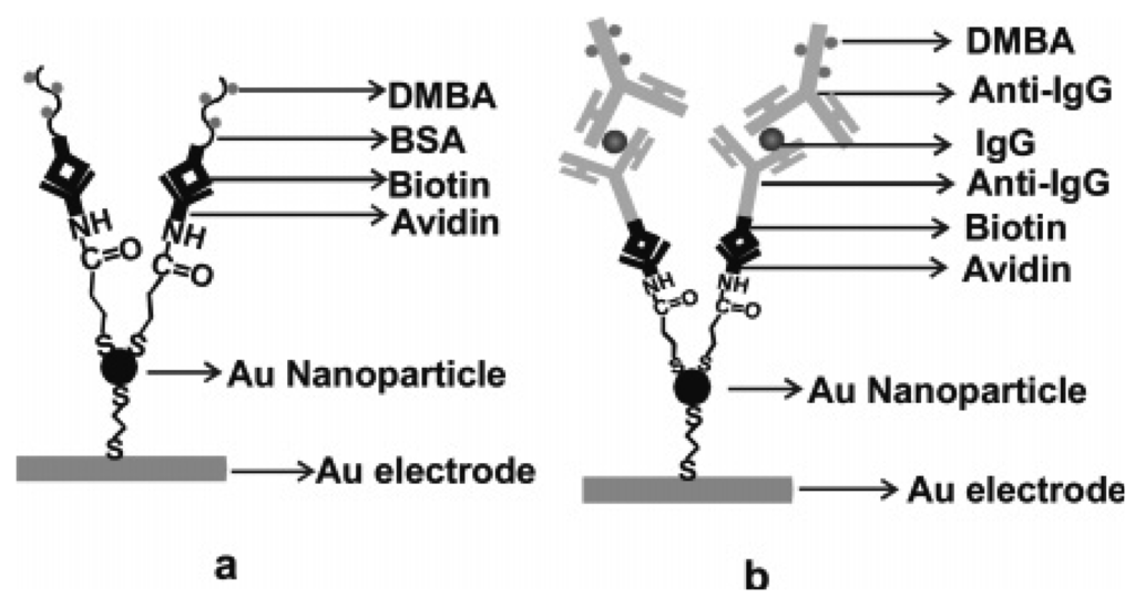 Schematic diagrams of immobilization of BSA (a) and IgG (b) on the gold electrode with gold nanoparticle amplification. Reprinted from Ref [20] with permission from The American Chemical Society.
