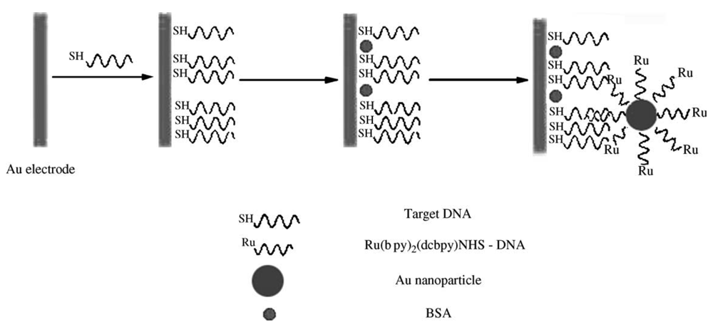 Metal nanoparticles were also used as ECL carriers in ECL probes for the fabrication of highly sensitive ECL biosensors [58-60]. Zhang, et. al. reported an ECL DNA biosensor based on ruthenium bis(2,2′-bipyridine)(2,2′-bipyridine-4,4′-dicarboxylic acid)-N-hydroxysuccinimide ester (Ru(bpy)2(dcbpy) NHS) used as a ECL label and gold nanoparticles as a carrier [58]. As shown in Figure 2, probe ss-DNA was self-assembled at the 3′-terminal with a thiol group to the surface of gold nanoparticle and covalently labeled at the 5′-terminal of a phosphate group with Ru(bpy)2(dcbpy)NHS and the resulting conjugate, (Ru(bpy)2(dcbpy)NHS)-ss-DNA-Au, was taken as a ECL probe. When the target analyte ss-DNA was immobilized on a gold electrode by a self-assembled monolayer technique and then hybridized with the ECL probe to form a double-stranded DNA, a strong ECL response was electrochemically generated. The ECL probe of Ru(bpy)2(dcbpy)NHS)-ss-DNA-Au employing multiple reporters per hybridization event enhances the ECL detection sensitivity due to its offering a remarkable amplification of hybridization events. A detection limit of 5.0×10−12 M for target ss-DNA was achieved with the gold nanoparticle amplification.