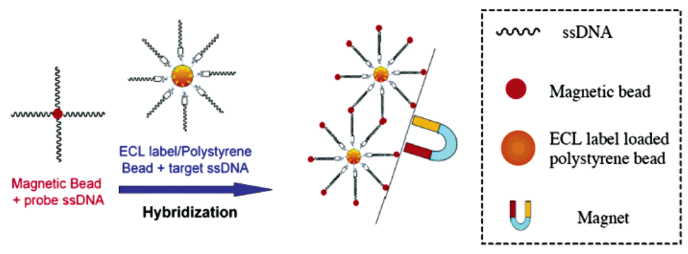 Schematic diagram of DNA hybridization on a polystyrene bead as the ECL label carrier and a magnetic bead for the separation of analyte-contained ECL label/polystyrene beads. Reprinted from Ref [62] with permission from The American Chemical Society.
