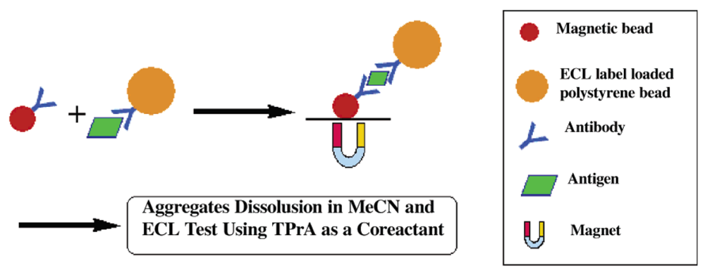 Schematic diagram showing the formation of a sandwich-type aggregate between an antibody-coated MB and an antibody-coated PSB containing entrapped ECL labels in the presence of the antigen species, and the separation of the newly formed aggregate with a magnet as well as the subsequent dissolution and ECL detection in MeCN using TPA as the coreactant. Reprinted from Ref [63] with permission from The American Chemical Society.