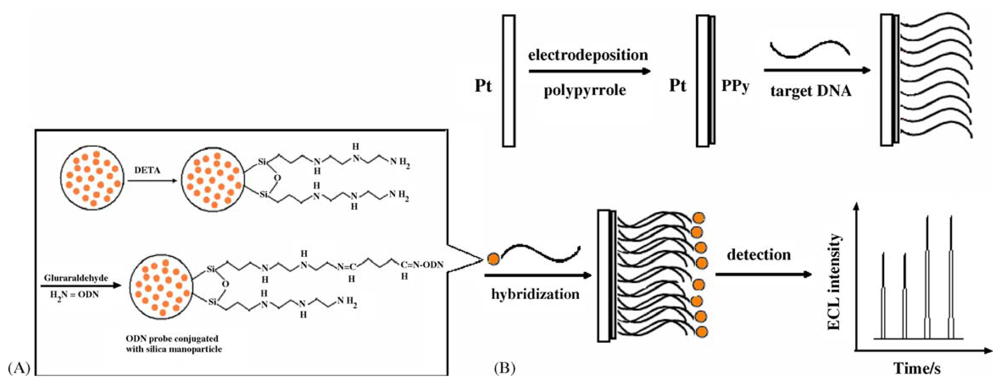 Fang et al. reported a ECL DNA biosensor with a nanoparticle-amplified response using silica nanoparticles as carriers for Ru(bpy)32+ probe [72]. As shown in Figure 5, RuDS nanoparticles were used for DNA labeling with trimethoxysilylpropydiethylenetriamine and glutaraldehyde as linking agents. The RuDS nanoparticle labeled DNA probe was hybridized with target DNA immobilized on the surface of polypyrrole modified Pt electrode. The hybridization events were evaluated by ECL measurements and only the complementary sequence could form a double-stranded DNA with DNA probe and give strong ECL signals. Due to the large number of Ru(bpy)32+ molecules inside silica nanoparticle, the assay allows detection at levels as low as 1.0×10−13 M of the target DNA.