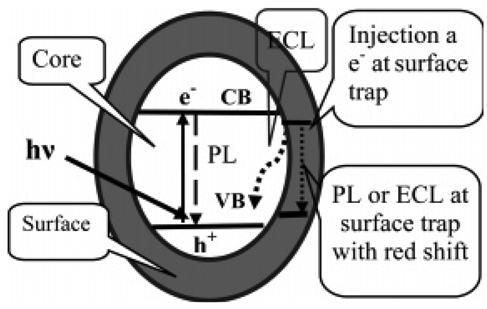 Schematic representations of PL and ECL process of nanoparticle in the core and on the surface. Reprinted from Ref [100] with permission from The American Chemical Society.