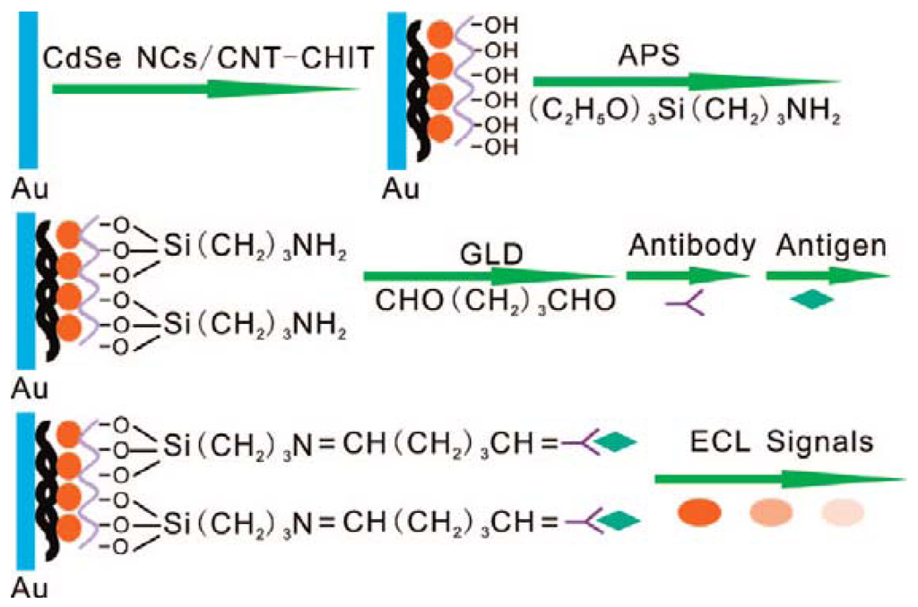 Zhu et al. recently developed a label-free ECL immunosensor for the sensitive detection of human IgG (HIgG) [101]. As shown in Figure 7, an ECL modified electrode was firstly fabricated by covered CdSe nanocrystals, carbon nanotube-chitosan, and 3-aminopropyltriethoxysilane colloidal solution on the Au electrode surface, which showed high ECL intensity and good biocompatibility. The modified electrode was used as an ECL immunosensor for the detection of HIgG after antibody was bound to the functionalized film via glutaric dialdehyde. The specific immunoreaction between HIgG and antibody resulted in the decrease in ECL intensity. The ECL intensity decreased linearly with HIgG concentration in the range of 0.02-200 ng mL-1, and the detection limit was 0.001 ng mL-1. The immunosensor has the advantages of high sensitivity, speed, specificity, and stability and could become a promising technique for protein detection. It has been suggested that these QDs ECL markers are better labeling agents than commonly used organic dyes.