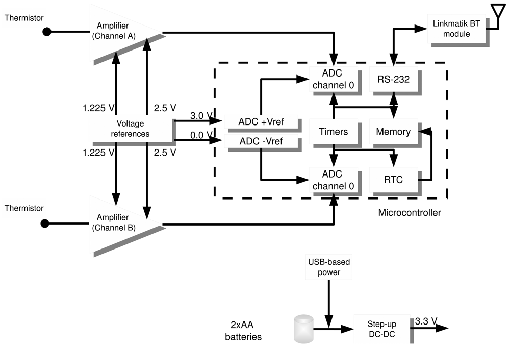 This section describes the main components of the device. Figure 1 shows a block diagram of the TherCom device and how the components are interrelated. The temperature monitor includes temperature sensors, a signal conditioner and amplifier for each channel, an analog to digital converter, a microcontroller, flash memory, and a Bluetooth module. It also includes a DC-DC converter to power the device from two standard AA batteries. Samples are transmitted via Bluetooth connection to the host computer at a rate of one sample per minute in real time mode, or off-line in data logger mode. At the host computer, data can be visualized and processed. The software tool includes a number of menu options for signal editing, entropy calculations, time-series analysis, and device configuration.
