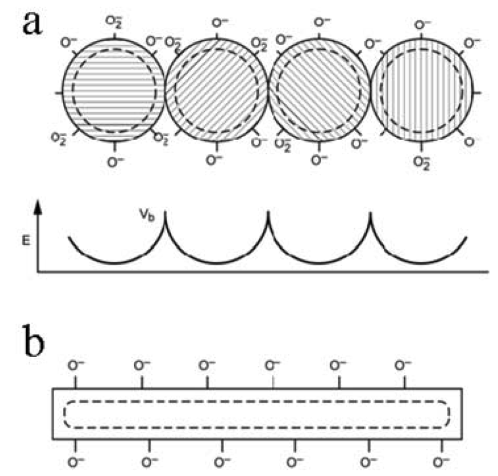 Schematic illustration of (a) potential barriers between nanoparticles formed by the juxtaposition of depletion layers within a polycrystalline nanofiber and (b) the continuous depletion layer surrounding the nanowire.