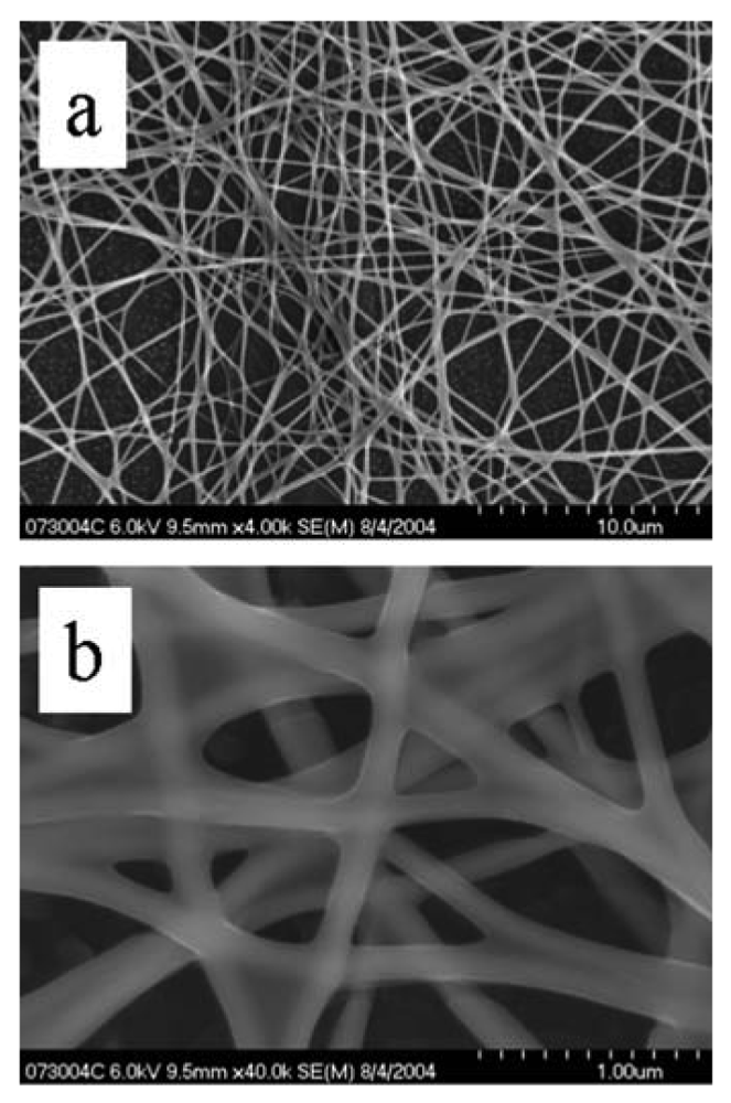 - Li, D.; Wang, Y.; Xia, Y. Electrospinning of Polymeric and Ceramic Nanofibers as Uniaxially Aligned Arrays. Nanoletters 2003, 3, 1167–1171. [Google Scholar]