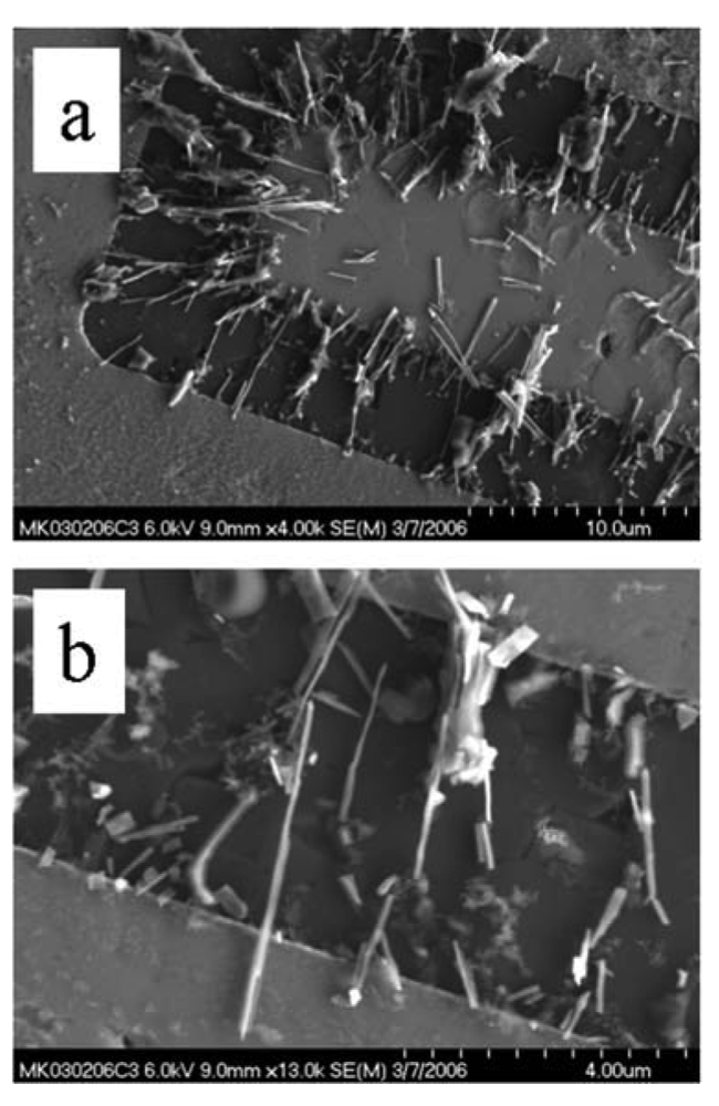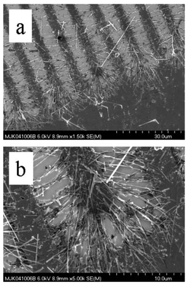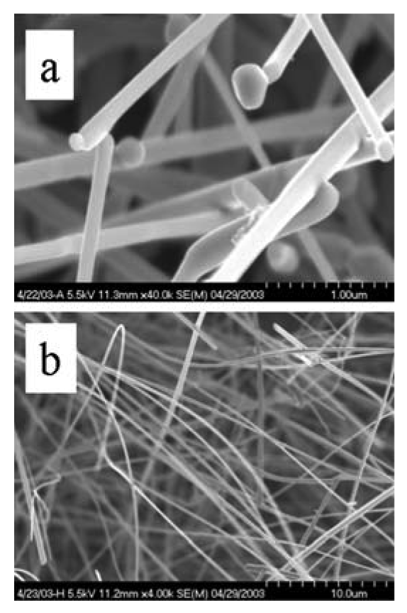 SEM image of (a) a single-crystal SnO2 nanowire, VLS mechanism. (b) a single-crystal SnO2 nanowire, VS mechanism.