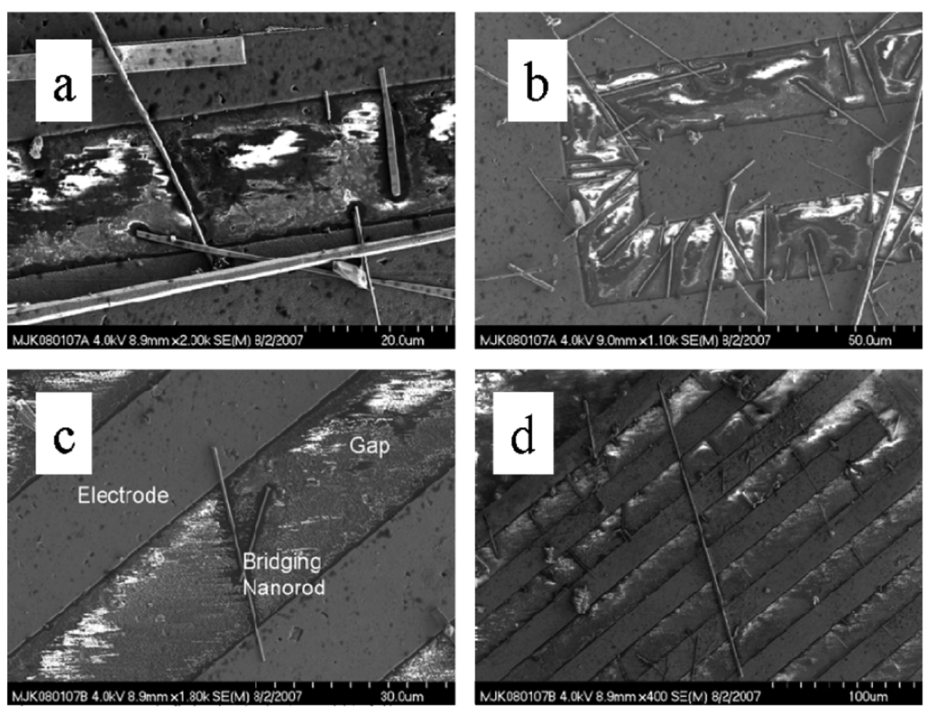 In this work, dielectrophoresis was used to align the nanowires produced by TEC and controlled oxidation to bridge the electrodes within the sensor pattern. The electrodes are arranged in an interdigitated comb pattern. An AC voltage is applied across the electrode grid using a function generator. For nanowires less than 10 μm long, 10 V AC at a frequency of 5 MHz was applied. For nanowires greater than 10 μm long, a lower frequency appeared to improve alignment. For example, lowering the frequency from 5 MHz to 500 KHz appeared to improve the alignment of SnO2 nanowires that had a length greater than 20 μm long.