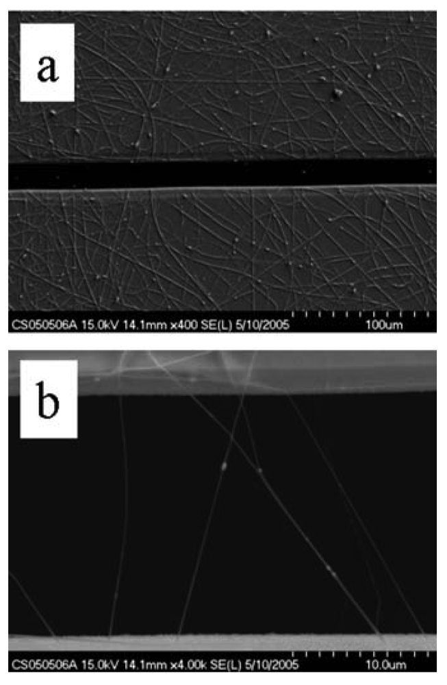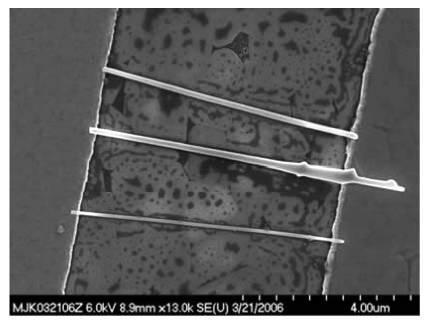 A significant feature of electrospinning is that a linear one-dimensional nanofilament is formed during the deposition process. This filament formed multiple bridges between the electrical contacts. Given the charged nature of the polymer solution, the nanofilament has a tendency to repel itself. This feature, combined with the formation of an image charge upon the electrodes filament, aids in the alignment of the fiber as roughly parallel strands form between opposing electrical contacts. Upon calcination, the polymer is oxidized and the resulting sol-gel is solidified to form a metal-oxide, polycrystalline nanofiber. This structure served as the polycrystalline, one-dimensional sensor element to be compared with the one-dimensional single-crystal nanowires as formed by the TEC approach described previously.