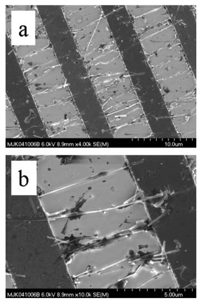 Basically, a suspension of nanowires was applied to the pattern and allowed to dry naturally. Dispersions were observed to be reasonably homogeneous without clumping. The drying process did not appear to redistribute the material, a fact attributed to the hydrophilic nature of the oxide nanowires and substrate. Hydrogen bonding likely occurred between both materials given both oxide surfaces are populated by hydroxyl groups. Electrical continuity was established by multiple bridging nanowires.