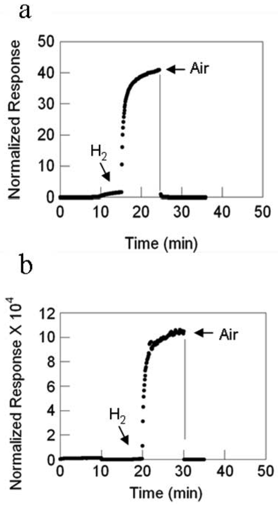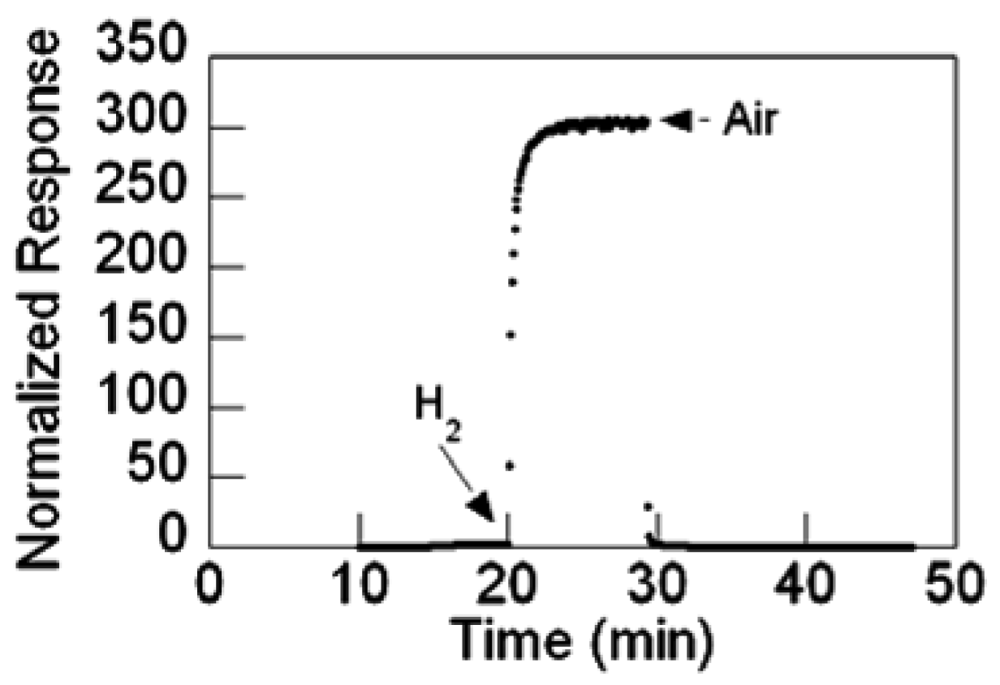 These results highlight the synergy of catalyst with metal oxide nanostructure. Catalysts can contribute to an enhanced sensitivity response via an electronic or chemical contribution. Electronically, the metal can remove electron density from the metal oxide by virtue of its electronegativity. With reduced charge carrier concentration and mobility, the metal oxide is thereby sensitized to reducing gases. Alternatively, the metal nanoparticle can actively catalyze the decomposition of adsorbates such as H2 molecules. The resulting H-atoms will undergo “spillover” to the oxide, react with either chemisorbed or lattice oxygen and release charge to the semiconductor resulting in an increased conductivity [33,45,46,49]. The relative contributions will depend upon the catalyst, reducingg gas and operating temperature.