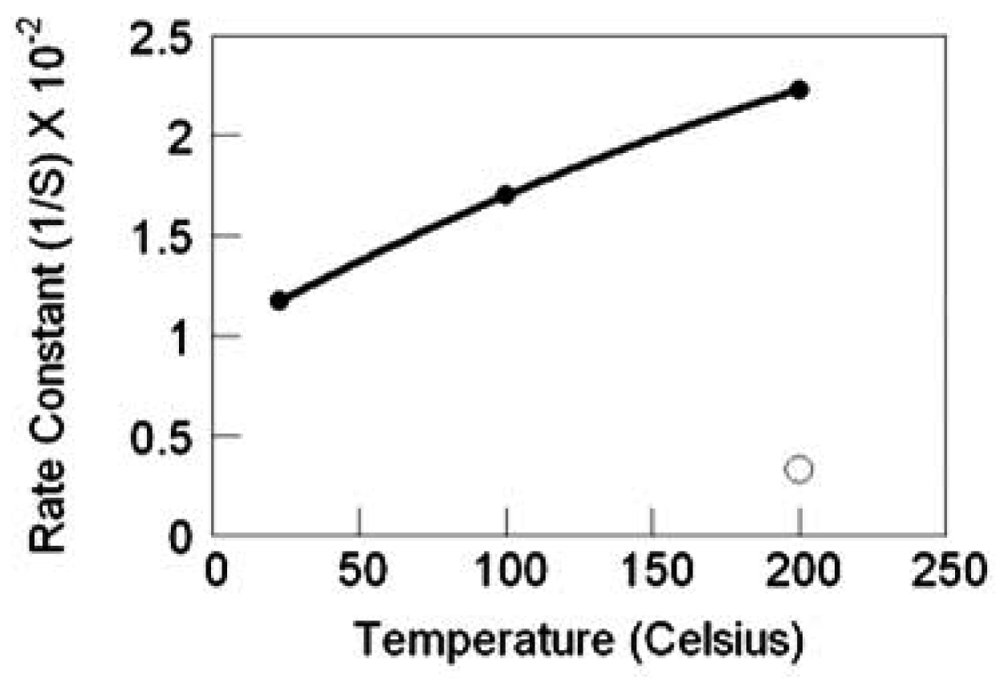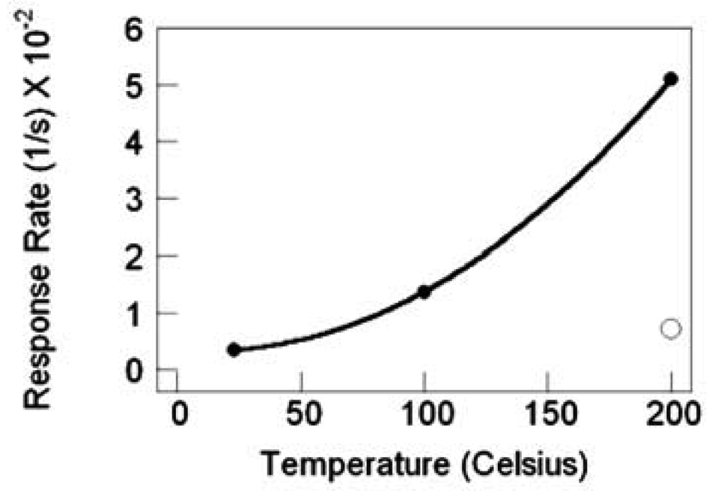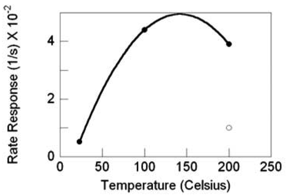 TiO2 nanowire sensor response rate versus temperature, filled circles are with Pt catalyst, the nonfilled circle is without catalyst.