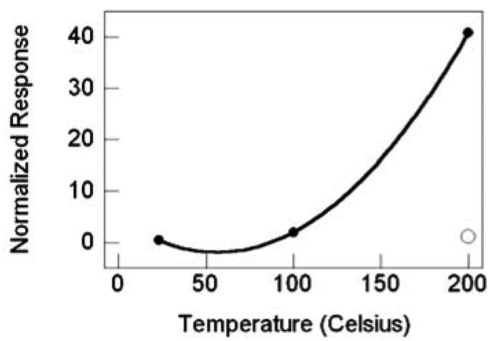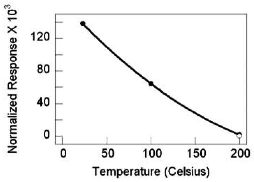 TiO2 nanowire sensor response versus temperature, filled circles are with Pt catalyst, the nonfilled circle is without catalyst.