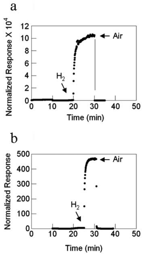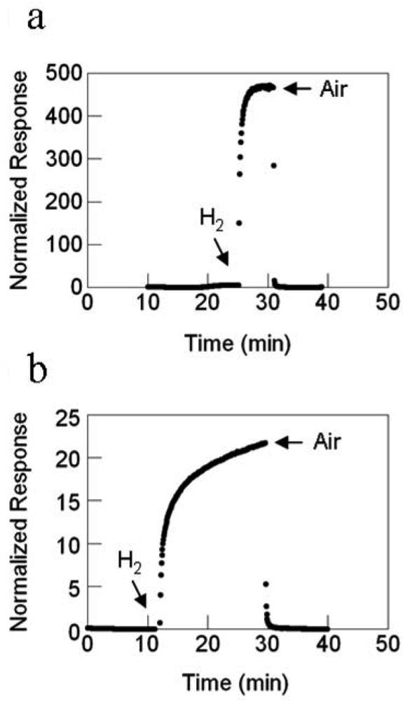 Conversely, the normalized response of the nanofibers with catalyst decreases with increasing temperature, being the highest at ambient, 23 °C. This decreasing response is interpreted as reflecting the open porosity created by the polycrystalline structure of the nanofiber in conjunction with its small radius. Adsorbates can access all exposed surfaces already at ambient temperature. Accessible surface area, as nominally governed by diffusional processes, does not increase with increasing temperature. Rather, with increasing temperature, chemisorbed oxygen species may be lost (desorbed) and/or transformed into more strongly chemisorbed species, thereby accounting for the decreasing response with increasing temperature. Nevertheless, the temporal response of the electrospun nanofibers improves with operating temperature, reflecting faster dissociation of adsorbing hydrogen. Regardless of operating temperature, sensitivity of the nanofibers is a factor of 10 to 100 greater than that of nanowires with the same catalyst for the same test condition. In summary, nanostructure appears critical to governing the reactivity, as measured by electrical resistance of SnO2 towards reducing gases. With regards to the sensitivity of the different nascent nanostructures, the electrospun nanofibers appear to win.
