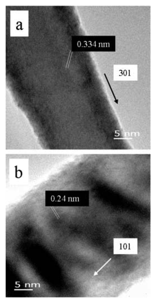 HRTEM image of (a) a single-crystal SnO2 nanowire, VLS mechanism. (b) a single-crystal SnO2 nanowire, VS mechanism.