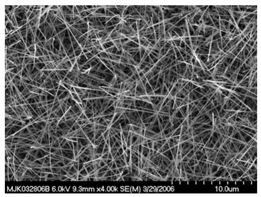 Direct metal oxide nanowire growth is possible upon a variety of foils, films, wires, and other pre-patterned metal deposits [23-27,35]. Controlled oxidation offers the capability to grow materials not readily accessible via other conventional methods, for example, TEC. In particular, refractory oxides such as Fe2O3, WO3, NbO2, TiO2, etc. are readily fabricated. Nanowires consisting of iron and nickel and copper and tin have also been demonstrated. It is possible to integrate this synthesis method with microfabrication methods producing thin films, traces, and other pre-patterned areas as growth temperatures are mild by comparison to those required for CNT synthesis.
