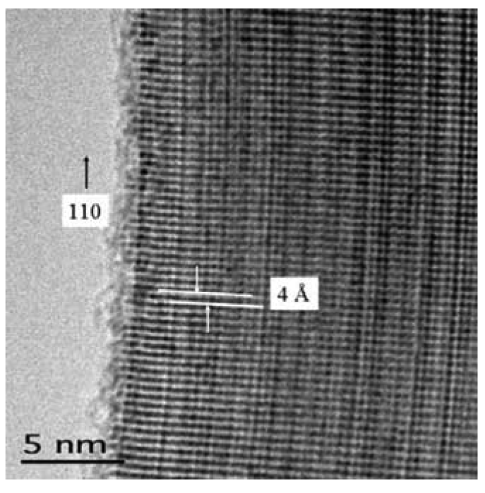 The high-resolution transmission electron microscopy (HRTEM) images in Figure 5 illustrate these differences for the SnO2 nanowires. While thermodynamic control leads to the most energetically favorable structure, kinetic control permits growth along different (non-equilibrium) crystalline facets. Control via either mechanism permits uniform growth rates that can be used to optimize crystalline structure and eliminate grain boundaries and crystalline defects. Highly crystalline materials result. This is particularly well illustrated for more complex crystallographies, such as the wurtzite structure of ZnO, as observed in Figure 6. The hexagonal faces clearly mark the equivalency of the surface facets with growth occurring along the c-axis.