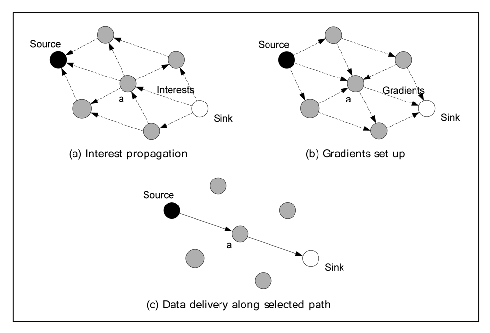 DD [] is a data-centric routing protocol based on the distributed mode. In DD, the propagation and aggregation of both interest and sensing data is determined by localized message exchanges between neighbor nodes. The next hop was only decided as a next route for multi-hop communication instead of whole route path. The operation of DD is divided into the two periods of interest propagation and the data aggregation.