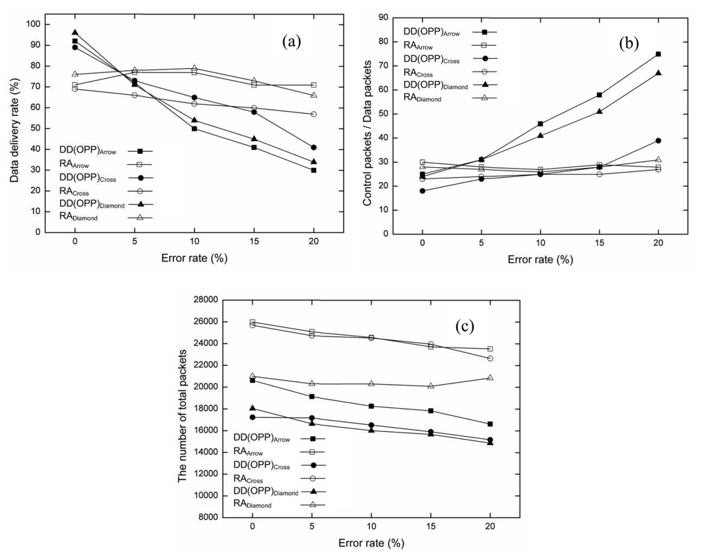 Figure 7 shows the data delivery rate, the protocol overhead and the total number of packets for each error rate with the random topology. Compared to the grid topology, the data delivery rate of OPP decreased more quickly with random topology as the error rate increased. From our analysis, the data delivery rate tends to be affected by errors due to the irregular distance among neighbor nodes. Because the irregular distance leaves few candidate routes in addition to the failure node, the number of alternative routes also decreases. As a result, the data delivery rate of OPP is very low with the random topology. In the random topology, RA shows a poor data deliver rate compared to the grid topology. However, RA shows still better data delivery rate than OPP as shown in Figure 7(a).
