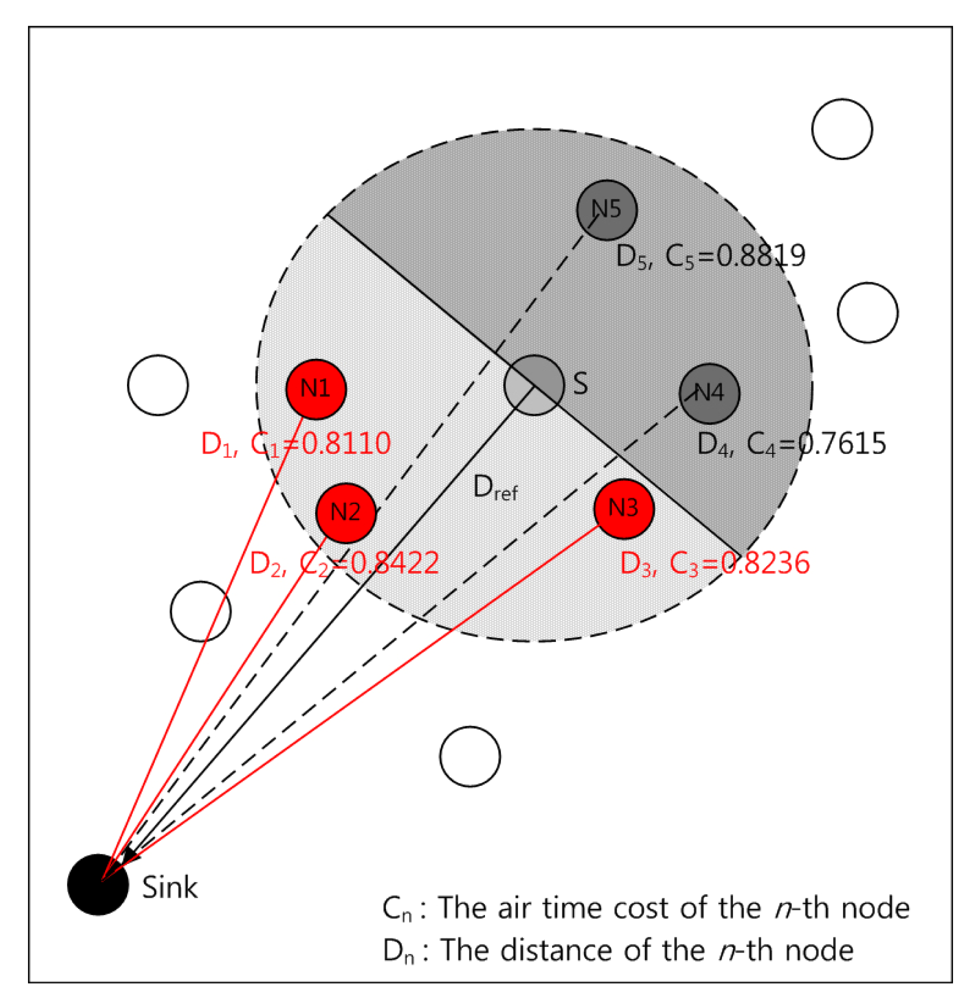 The air time cost was calculated and updated whenever receiving the interest and data from its neighbors. Also, the distance between each node and its sink node was calculated by examining the interest packet including the position of the sink node. Each node already knows the position of sink node and neighbor nodes from interest propagation. This directional information can be used to find closer nodes to the sink among neighbor nodes by comparing with the reference distance (Dref) of the sender S. The distance to the sink node of each node was considered to avoid the loop and longer hops caused by selecting an irrelevant node with inverse direction.