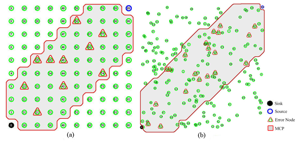 Figure 4 shows MCP used for each topology in the simulation. In Figure 4, a gray area indicates MCP and red triangle represents error-prone node with a given error rate (i.e., 10%) for each topology. The error group stands for the potential error nodes in the MCP. The error rate indicates the number of selected nodes in all nodes of topology, but the error-prone node should be randomly selected from MCP. The error rate represents the instability of lossy WSNs at a given error rates (%).