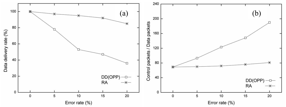 The protocol overhead of OPP increased more as the number of control packets and transmission failures increased. RA maintains low protocol overhead compared to OPP, RA does not affect the error rate significantly in spite of increasing the error rate with RA. RA keeps a higher data delivery rate at every error rate. In addition, the air time cost and the fast re-route scheme are used to provide reliable communication with RA. Additional control packets do not need to be sent to remove the loop. RA re-routes to an alternative path after a failure. For this reason, although the total number of packets with RA is larger than that with OPP, the data delivery rate and the protocol overhead of RA are better than OPP. Table 3 summarizes the results of the simulations.