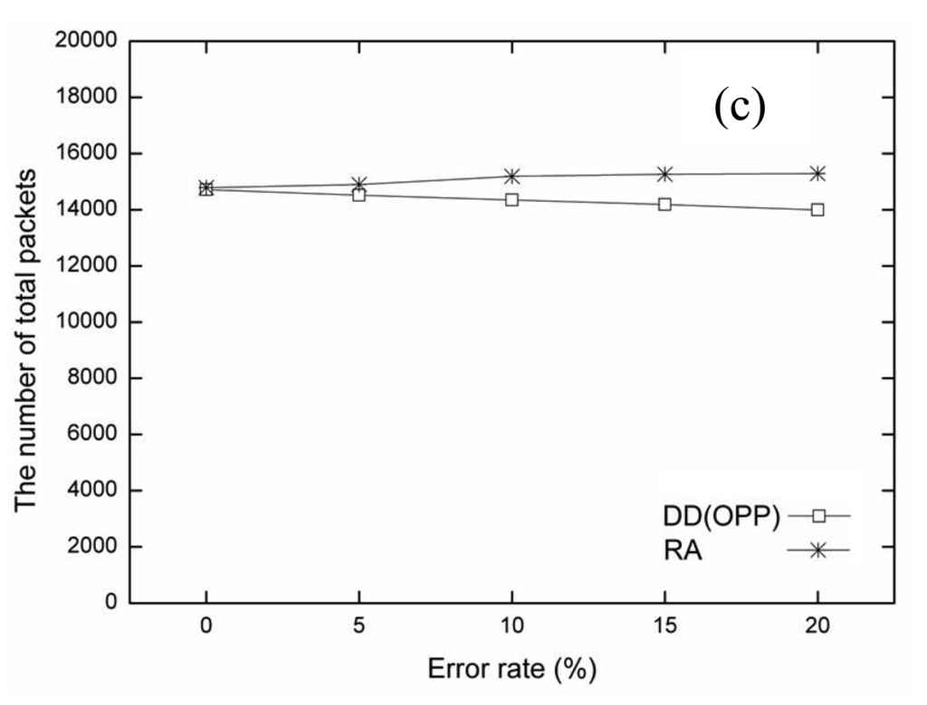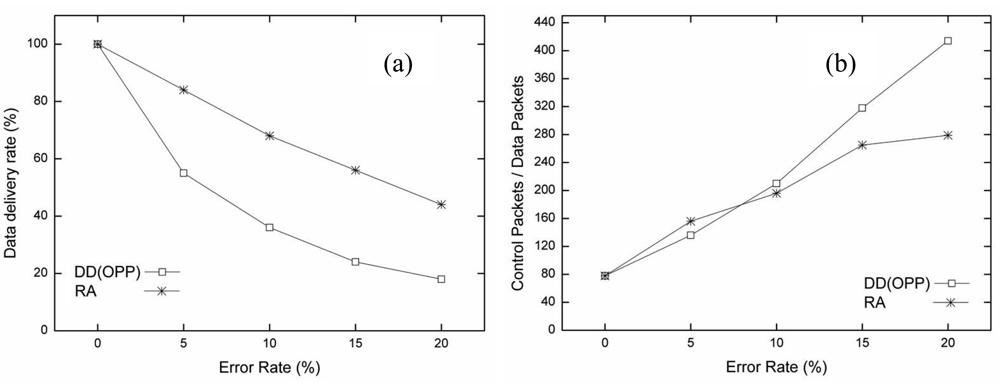 The protocol overhead of RA is also smaller than OPP. Figures 5(b) and 5(c) show the simulation results. The ratio of control packets over data packets is shown in Figure 5(b) and the total number of packets is shown in Figure 5(b). As the error rate increases in OPP, the number of control packets increases rapidly in inverse proportion to the number of data packets. If the route is broken during data transmission period, the data can be sent back to the sender. When the sender receives the packet from the receiver node again, the sender assumes the route is a loop. Removal of the packet loop relies on negative reinforcement.
