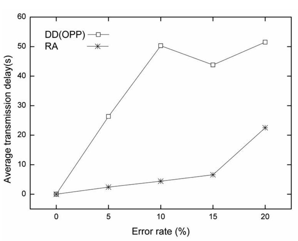 Figure 8 shows the average transmission delay time for each error rate in a comparison between OPP and RA. The average transmission delay of RA is also smaller than that of OPP for all error rates with the random topology. Compared with the grid topology, as time increases, OPP and RA show more delay at a certain time, as shown in Figure 8. In particular, the maximum average transmission delay with OPP is seen more frequently over all error rates. The lossy situation occurs more frequently with random topology due to its random characteristics. The average transmission delay of RA also exceeds that of the grid topology. However, compared to OPP, RA shows small average transmission delay with the random topology.
