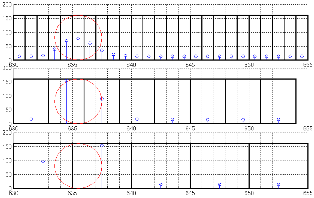The last case is similar to the second one, but the thickness of the fringe is similar to the fiber diameter. In this case, the energy of the fibers may be higher and the number of steps is reduced, but it is more probable that in two (or more) positions, the fibers receive the same excitation (ambiguous cases). This situation has been represented in Figure 3c where the last fiber is surrounded by a circle.