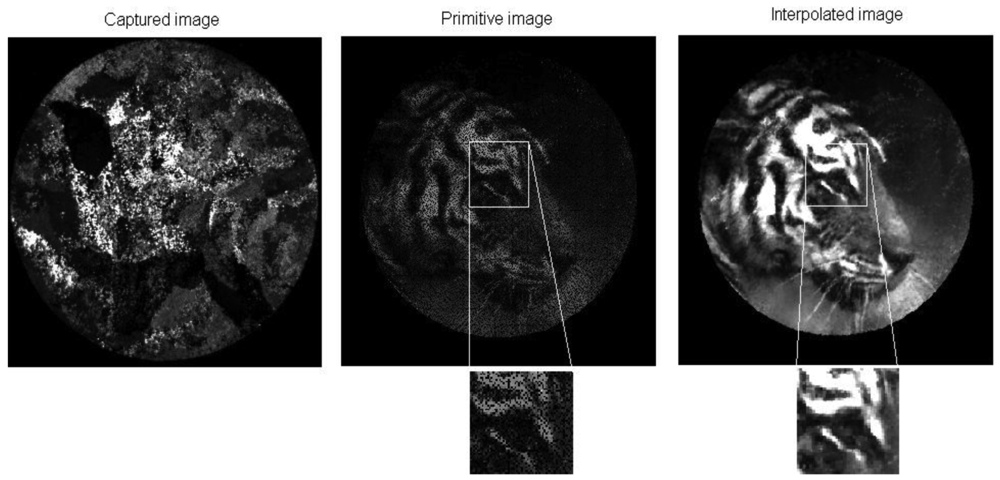 A brief series of images of a tiger is given in Figure 6, showing the progressive transformation of the original image into the finally reconstructed image. The primitive image is obtained by rearranging the values of gray levels obtained from the fiber centroids in the bundle image, as set out in the LUT. The primitive image has about 342 × 342 pixels defined by the scanning step used. It takes about a second to reorder the information.