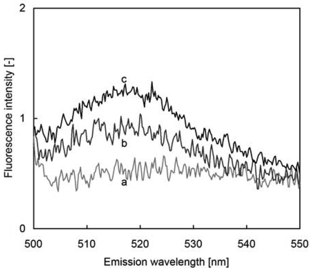 Fluorescence spectra of FITC-protein A immobilized glass in bovine plasma are shown in Figure 2. Without the glass, broad band emission of bovine plasma was observed (line a in Figure 2). This fluorescence is emitted in the presence of plasma protein and bilirubin [10]. After setting the FITC-protein A immobilized glass in the plastic cell, a maximum fluorescence intensity was observed at 520 nm (line b in Figure 2). The maximum fluorescence intensity with FITC in PBS at 520 nm indicates that the FITC-protein A is immobilized on the glass [8]. By addition of IgG up to 78 μg/mL, FITC emission at 520 nm was enhanced (line c in Figure 2). Since a steady state of fluorescence intensity was reached at 15 min after addition of IgG solution, IgG measurements were performed after 15 min.