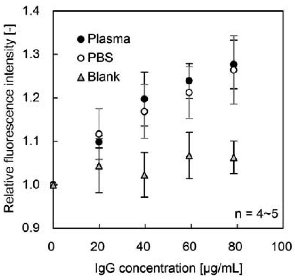 According to the Student's t-test, there was a significant difference in relative fluorescence intensity between 0 and 20 μg/mL IgG in bovine plasma (P < 0.05, Figure 3). Hence IgG is detectable by the fluorescence enhancement at over 20 μg/mL IgG in bovine plasma. However no significant difference was observed between plasma measurement and blank test at 20 μg/mL IgG (P > 0.05). It seems to be caused by the dispersion of FITC-Protein A-immobilization in each sample glass and plasma-related noise for fluorescence. More sensitive measurement will be achieved by the further improvement in immobilization method and choice of fluorescence dye, because fluorescence wavelength of FITC is overlapped with that of plasma.