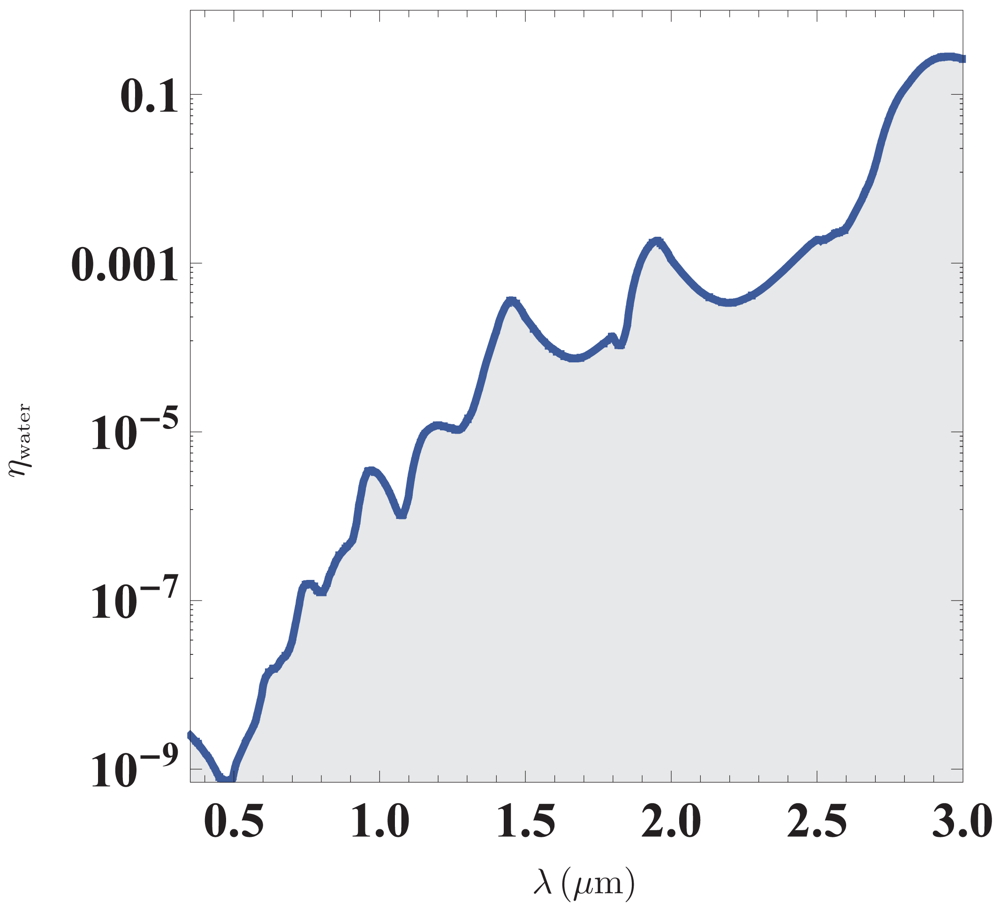 In Figure 1 we illustrate the implications of this result by showing experimental data for water [20]. Experimentally, η may be obtained from the exponential damping in a transmission measurement where the absorption coefficient is given by αabs = η4π/λ. We emphasize that for any resonator design, the detection limit will tend to be higher unless the resonance line-width is dominated by liquid absorption. Below we offer a few examples of resonator architectures which have been considered in the literature.