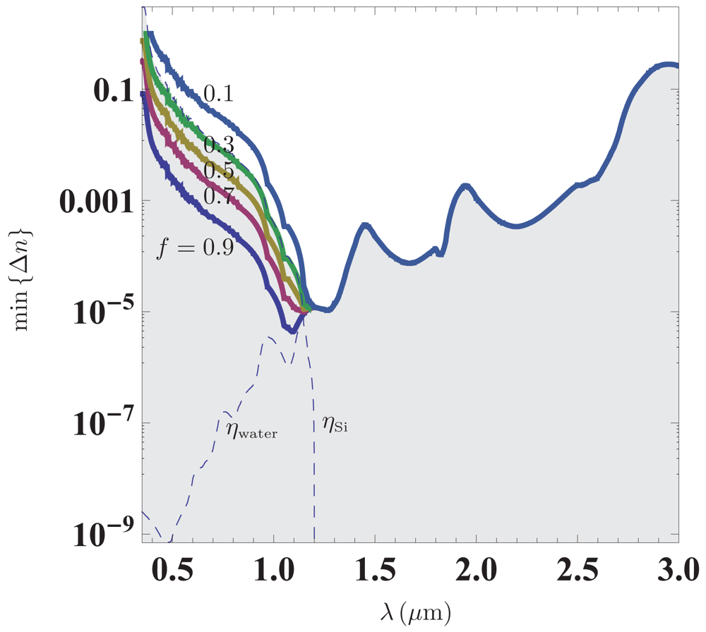 Since the imaginary part of the refractive index is strongly dispersive for both water and silicon, the ultimate detection limit clearly depends on the operational wavelength. Furthermore, the fact that water is most transparent in the visible, while silicon transmits best in the near-infrared, suggests that there exists an optimal wavelength for the detection limit in terms of the refractive-index change. Figure 2 illustrates the ultimate detection limit for silicon-based resonator structures infiltrated by liquid for varying values of the light-liquid overlap f. Calculations are based on data for water and silicon tabulated in the handbooks by Palik [20, 26]. Quite interestingly, the plot reveals that an optimal detection limit of the order 10−5 occurring around the onset of transparency in silicon at λ ∼ 1.1 μm. We emphasize that this ultimate detection limit of course implicitly assumes that the resonance has Q0 > 105. So far, quality factors of the order Q ∼ 5 × 104 have been reported in microfluidic silicon-based photonic crystal resonators [27], though the liquid was not water. It is also interesting to note that despite the transparency of water in the visible, the damping in silicon jeopardizes any realistic application with f ≲ 0.9.