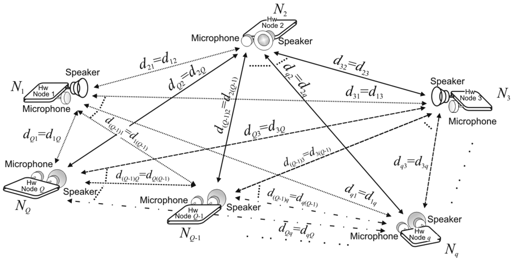 The system architecture is depicted in Figure 1. It consists of an acoustic sensor network, where every object Nq (q ∈ {1, 2,⋯,Q} and Q is the number of nodes in the system) carries a sensor node with a speaker, a microphone and the associated hardware. Acoustic sensing technologies are used since they are suitable for fine-grained location and widely spread due to their low cost, easy implementation and availability in assorted mobile systems.